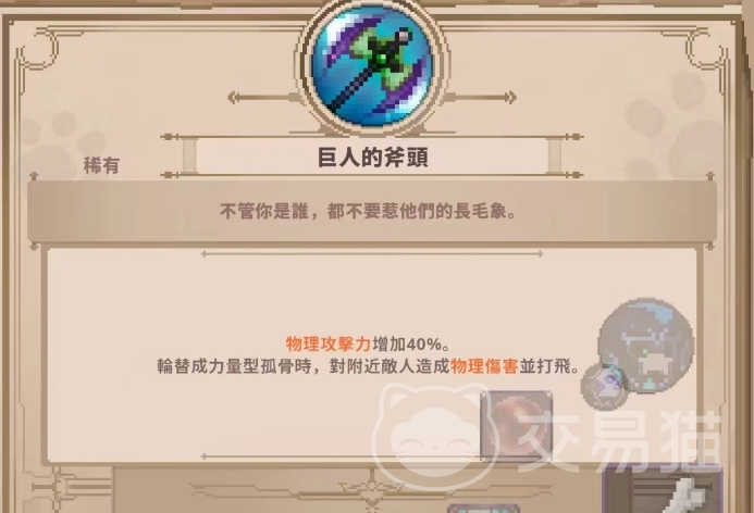 巨人的斧头:一把稀有品质的斧头,效果是增加40%物理攻击力,对于物攻型头骨非常契合,同时你在持有这一装备时如果替换力量型头骨上场,还会对附近敌人造成一定的物理伤害和击飞效果。