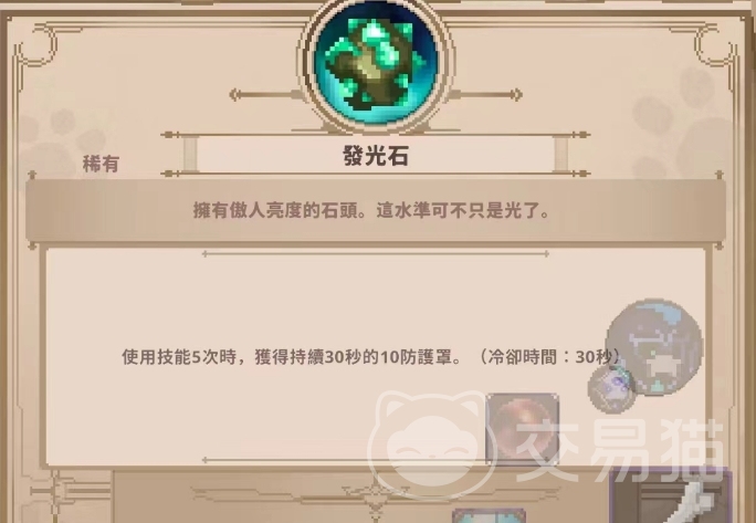 发光石:表面闪烁绿光的稀有装备,外观虽然是一个石头,但却可以在连续使用五次技能时提供10点护盾,护盾持续三十秒,搭配其他要塞刻印的装备甚至可以让你的角色无伤刷图。