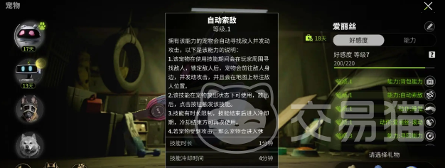 说到爱丽丝这个宠物,真的挺好用的。它的技能挺直接的,就是当它感应到周围有敌人的时候,点一下它就会开始自动锁定敌人,这个过程会持续一分钟。如果找到了敌人,它就会冲过去放一个震撼弹,还会让敌人持续掉血。不管找没找到敌人,用完技能后爱丽丝都需要休息四分钟。爱丽丝还有个挺大的保险箱空间,升级后能有3x4那么大,大家都挺喜欢它的。