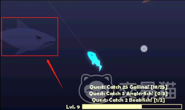 钓鲨鱼也是有技巧的,因为鲨鱼只存在海底的位置,我们在放下鱼饵后不要拉线,要一直下沉,直到沉入深不见底的海底,我们再慢慢收线,找到鲨鱼后,它会吃我们钩子上的鱼并扯我们的线,这时我们就可以将其钓上来了。