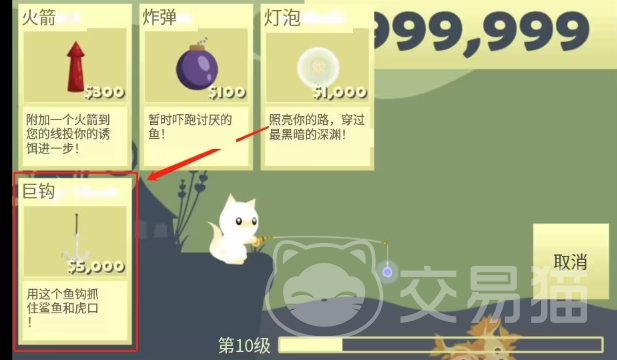 除了鱼竿和鱼饵外,我们还要买两个道具,分别是火箭和巨大钩子,火箭能帮助我们把鱼竿抛的更远,巨大钩子能帮助我们钓鲨鱼,物品准备齐全后我们就可以开始钓鱼了。