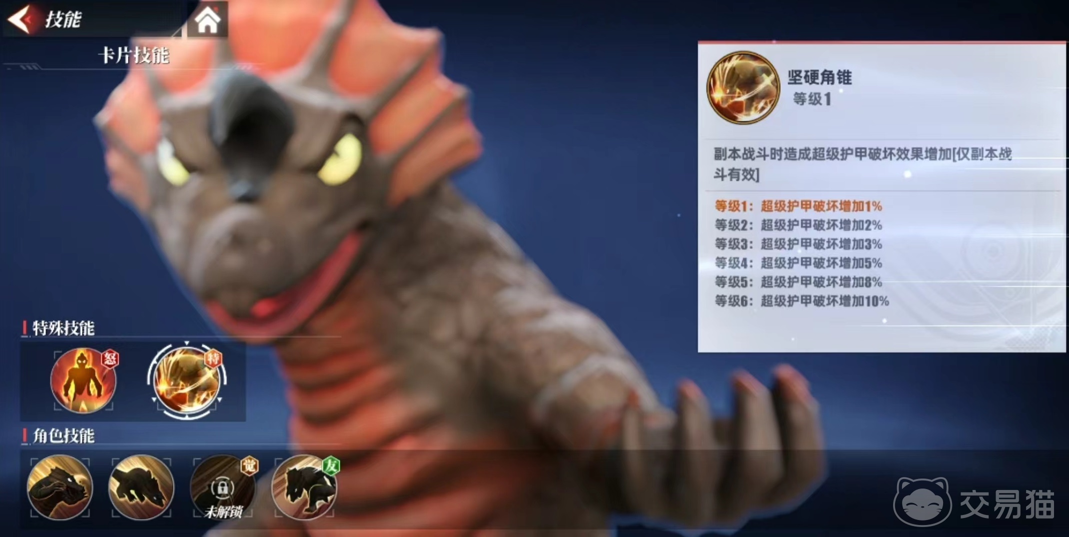 阿基拉所具有的特殊技能坚硬角锥,能够在副本战斗时发挥效果,造成超级护甲破坏,仅在副本战斗中生效。在一些比较特殊的副本战斗中,利用好超级护甲破坏可以给对方造成更大的输出。所以大家当卡住主线的时候,就可以尝试让阿基拉来进行辅助,这样会有意想不到的效果。