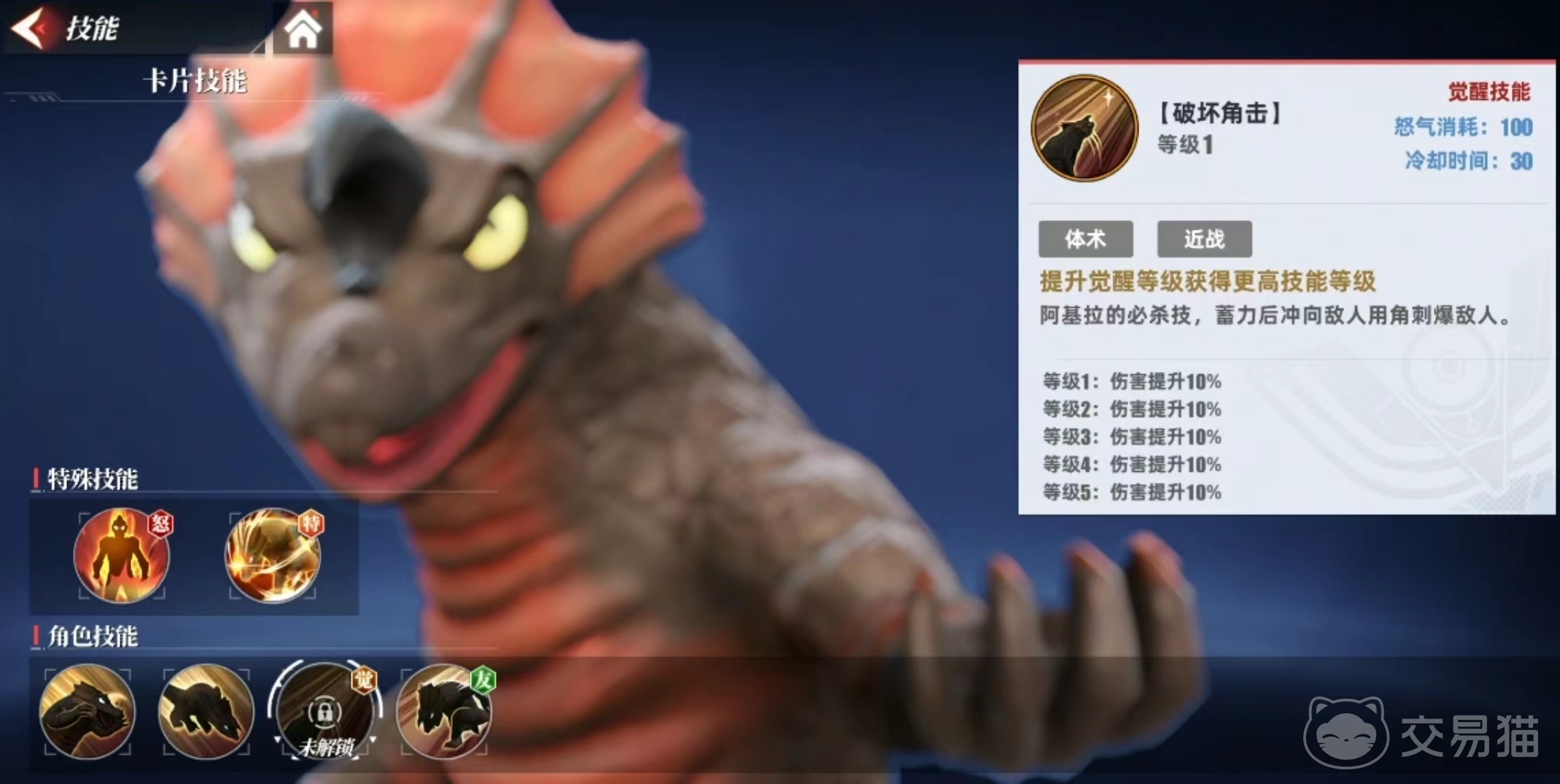 接下来是觉醒技能破坏角击,作为阿基拉的必杀技,需要蓄力后才能释放,冲向敌人用角攻击目标。该技能伤害是比较高的,而且提升觉醒等级后技能等级也会一定提升,虽然有着蓄力时间,但是冲向目标后对方将很难抵挡。最后是角色支援时所能带来的友情技能神速冲击,超高速通向目标,造成额外流血。虽然流血造成伤害不高,但是可以和很多效果配合起来,而且在高速冲击目标后能够起到控制和反击作用,是现在比较热门的进攻型选择。