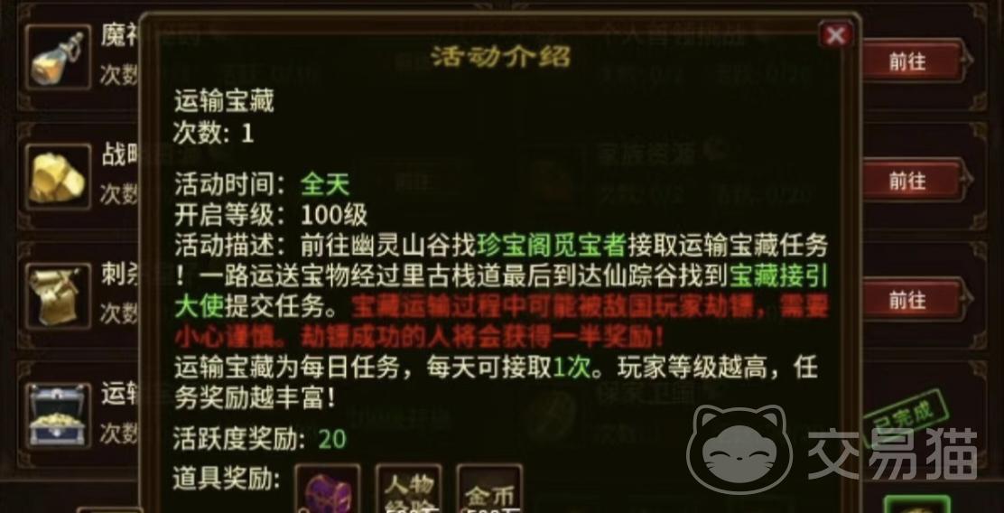 这个任务等到升到对应的等级的时候,玩家就够发现一个日常的任务,这就是需要玩家去运输宝藏,这个每天只有一次机会,这个运输宝藏就是让玩家们去护送宝藏,但是事情并没有那么简单,经过小编的不断试验后发现,在这整个运输过程中是不能传送的,而且这一条路真的特别长,中途也会被路过的怪物追赶,等到运输完成后会给玩家加上二十的经验值。