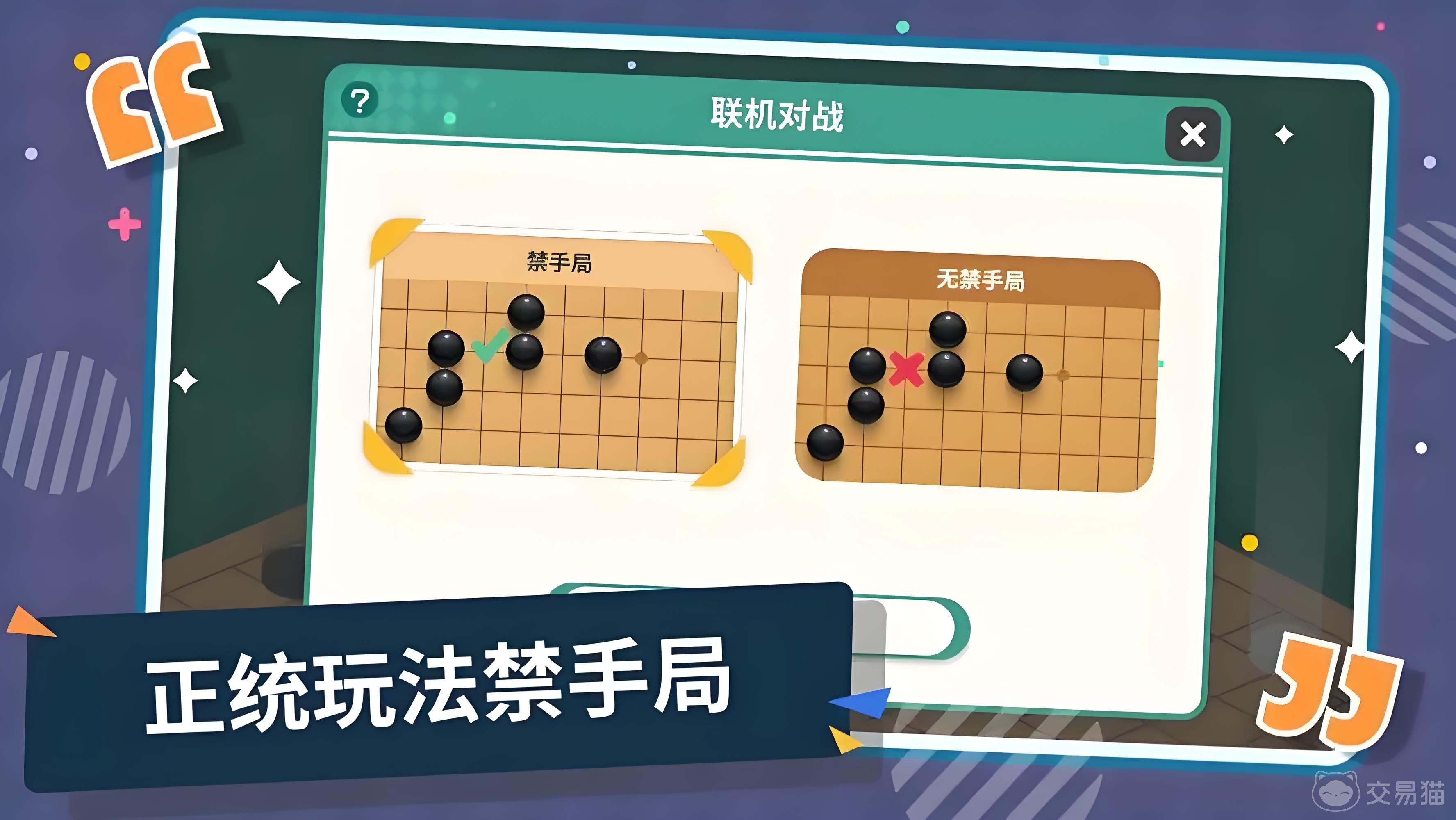 在这款游戏中的采用了大家都非常熟悉了解的五子棋游戏玩法,游戏还提供多种不一样的模式,每一种模式中的玩法都有着极高的挑战性,想要取得博弈的胜利,我们需要好好研究棋局,思考下棋的思路。游戏中的五子棋分为黑子和白子,每一次开局都要选择好棋艺,选黑子的一方先走,白子随后。