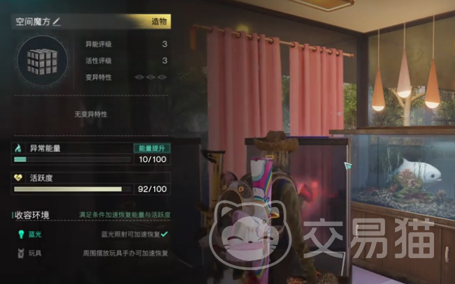 当然除了这个地方,其他区域的异常门扉也可能会刷新空间魔方。大家可以在大世界或者交互地图上仔细找找,说不定就能找到它呢。当我们成功收容了空间魔方之后,就可以把它放在收容仓里。这个收容仓很神奇,会自动帮助空间魔方回复异常能量。如果能量不足了,我们可以通过一些简单的方法来提升它。比如在头顶放一个蓝色的筒灯,或者在附近放一些玩具手办,这些方法都能提升异常能量的恢复速度,最高可以提升50%。
