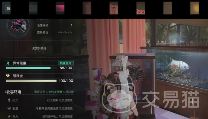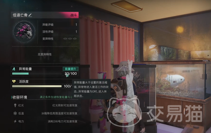 收容成功后,玩家就可以把它放在收容仓里了。在收容仓里,它会自动回复异常能量和活跃度。如果能量不够了,玩家可以通过兑换活跃度来提升能量值,每次可以提升100点。另外,玩家还可以在收容仓上方放置红色的筒灯来为它提供光照,或者附近放置冰箱降低温度,甚至是连接电力,这些都可以提高它的能量回复速度,据说最高可以提升28.5%呢。相信大家对“低语亡骨”这个宠物已经有了一个大致的了解了吧?如果玩家也觉得它很有趣的话,不妨试试去收容一个看看,说不定它会成为玩家冒险路上的得力助手。