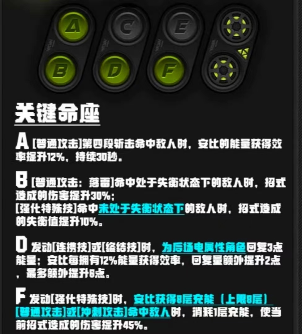 那么在选择角色后,是不是就只有一两种玩法可以选择了呢?很多玩家在看到绝区零的角色技能不多时,就有了这样的担忧,这时就需要介绍我们的命座系统了,一个角色最多可以拥有六个不同的命座,且这些命座的效果完全不同。