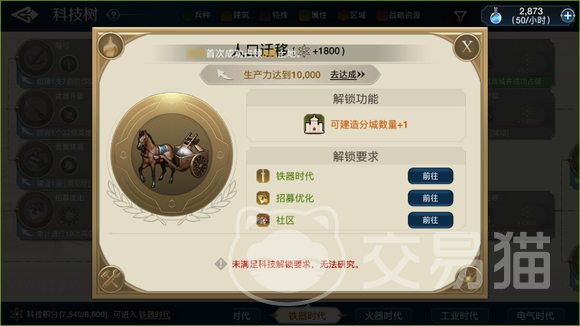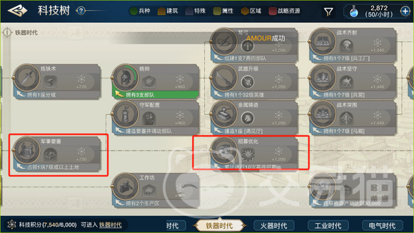 解锁人口迁移科技需要三个条件,达到铁器时代、解锁招募优化、解锁社区。所以我们在点亮军事要塞之后立刻解锁招募优化,主线任务也达标,就可以解锁点亮人口迁移了。