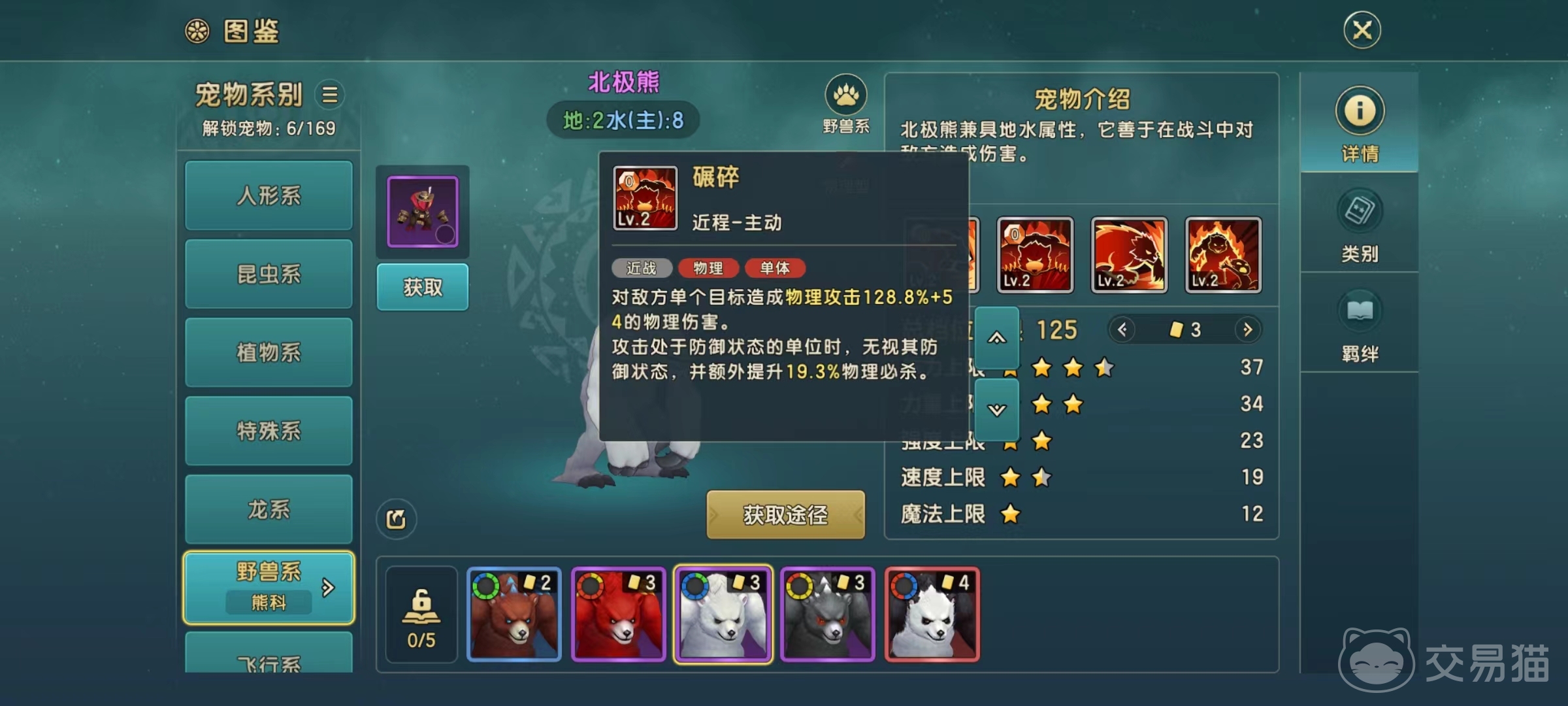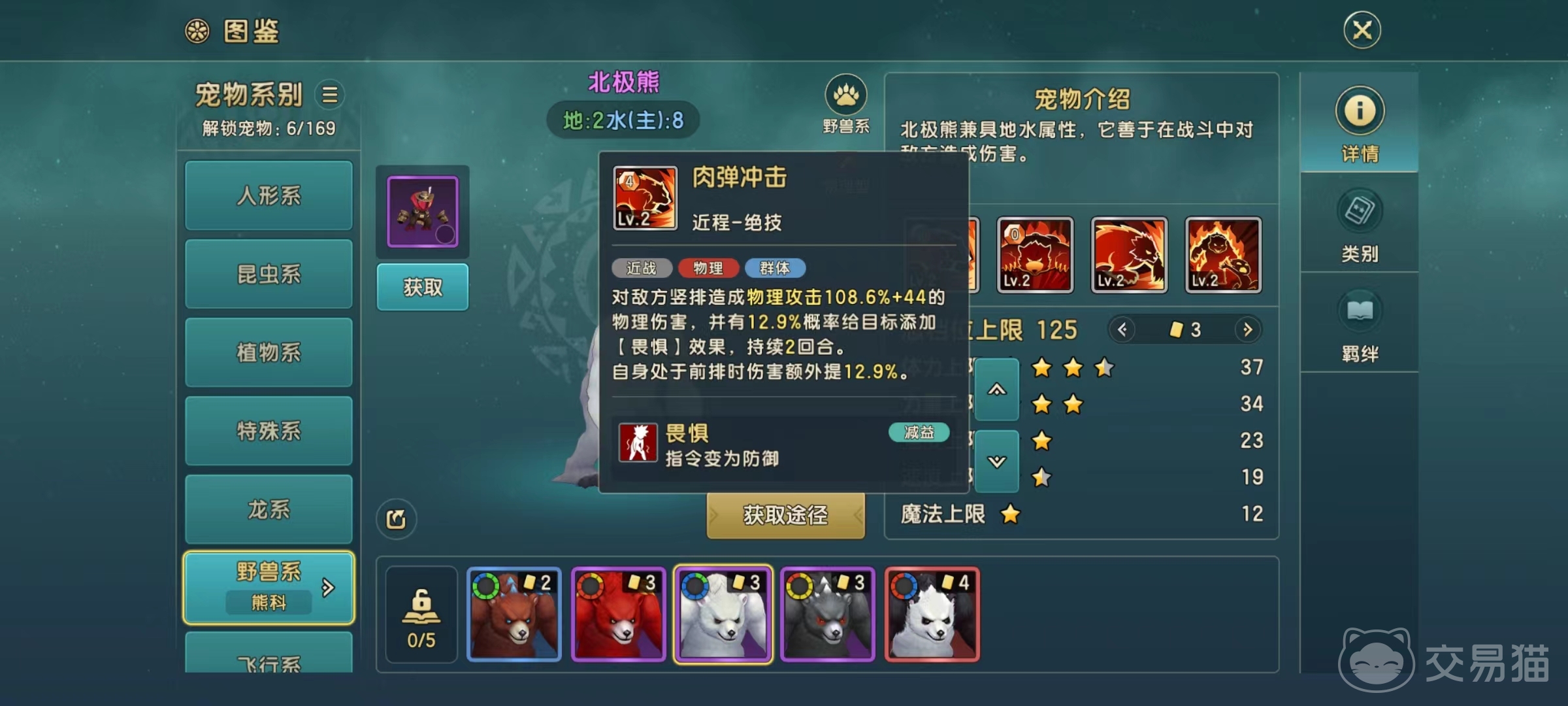 进站主动技能碾碎,选定敌方单个目标后造成一次高额物理伤害,如果对方正处于防御状态,那么无视防御状态并提高物理必杀。最多能够提升19.7%的物理必杀几率。该技能可以和绝技合起来使用,如果对方没有防御,也可以利用触发的畏惧使其被动防御,这样也能够触发主动技能伤害加成效果。第3个是被动技能碾压,当造成伤害时,会根据自身剩余生命值百分比附加额外伤害,并且回复一定的生命值。有了这一技能,北极熊就拥有了恢复能力,也相当于提高了战场上的生存。