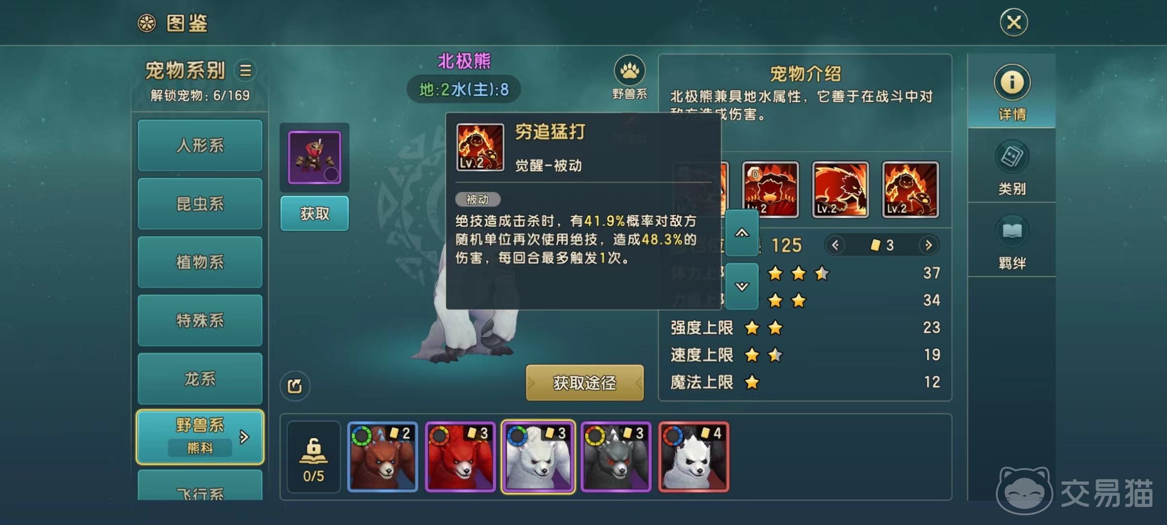 最后一个是被动穷追猛打,在绝技造成必杀时,有几率对敌方随机单位再使用一次绝技。该次造成伤害有百分比缩减,但最多能附加74.7%绝技能的伤害,每回合最多触发一次。这就是北极熊在战斗中输出非常狂暴的原因,但比较看脸,如果在每回合能够触发出来,两个绝技对敌方伤害是非常大的。技能提升到满级时触发概率还是比较高的,这一点可以放心。