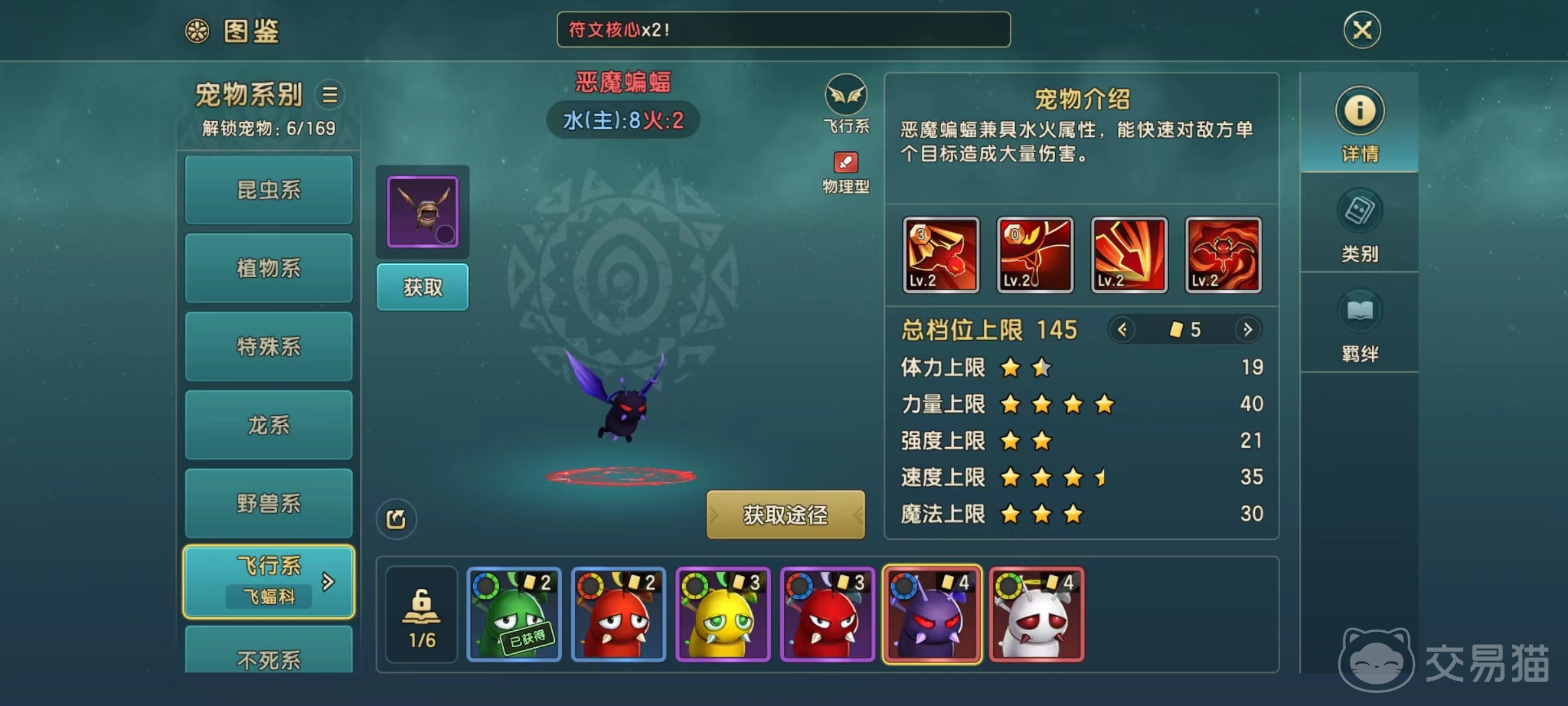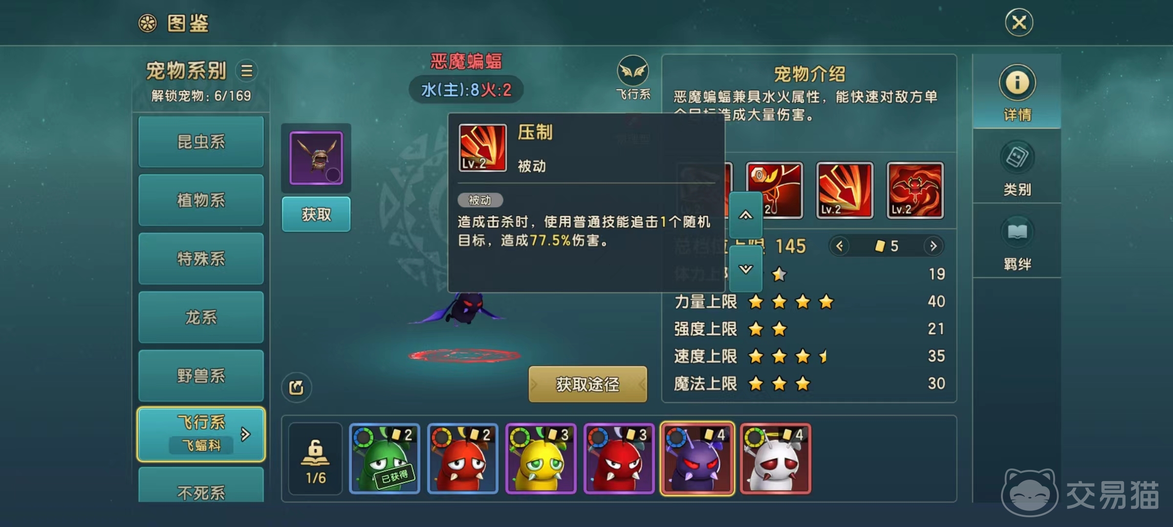 恶魔蝙蝠初始就有四档位的强度,自身在体力上限方面有着很大的优势,它具有水火这两种属性,以水属性为主,能快速对敌方单个目标造成大量伤害。自身的普通被动压制,在造成击杀时,使用普通技能追击一个随机目标。觉醒被动为恶魔,效果是在使用绝技时有一定的几率不获力竭状态,如果造成击杀,则必定不会获得力竭。本来力竭是绝技很大的负面效果,但有了这样的被动就有可能避免。