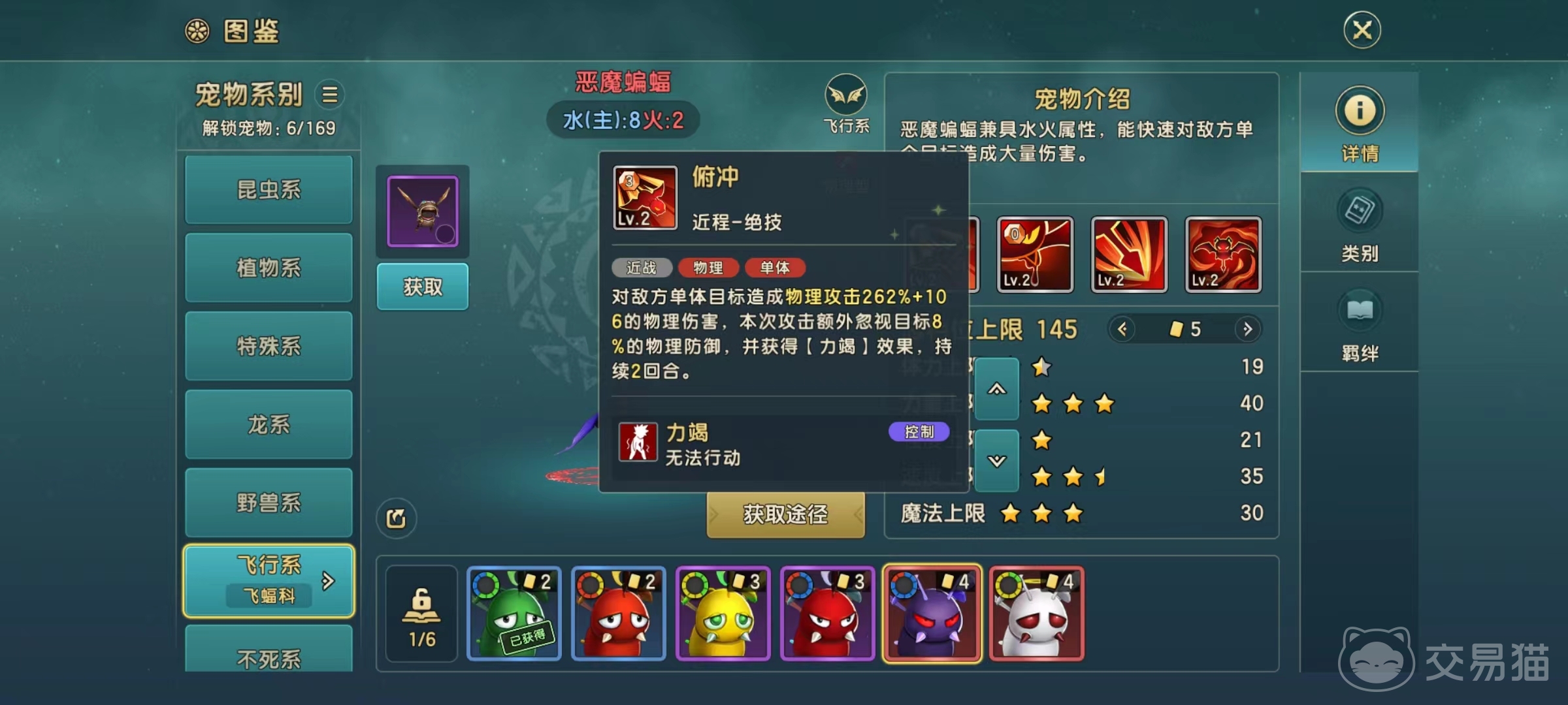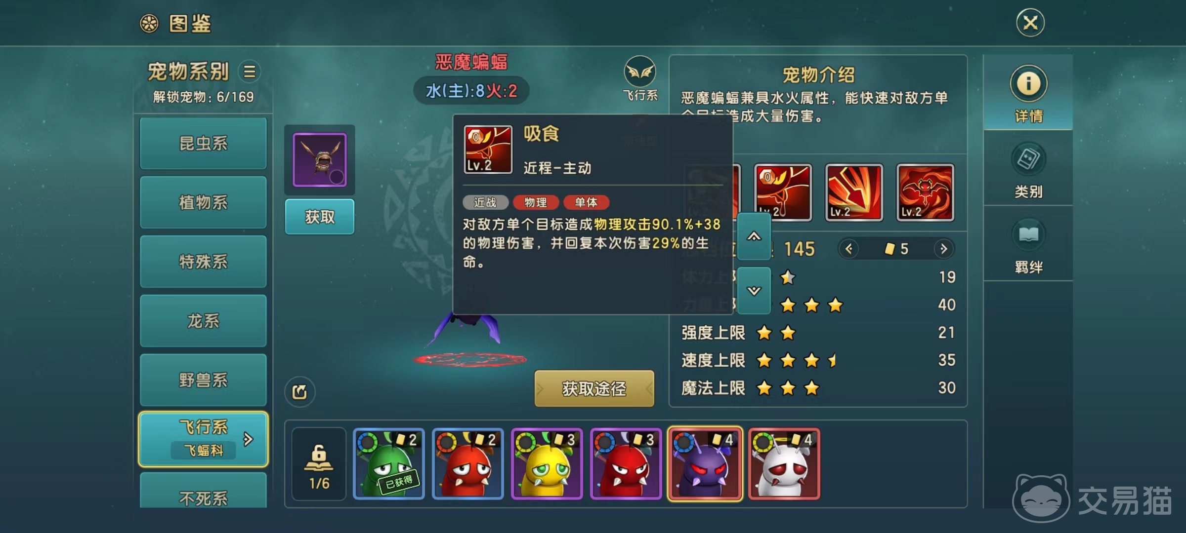 恶魔蝙蝠的主动技能吸食,对敌方单个目标造成物理伤害后,按照本次伤害比例恢复血量,最多能够恢复本次伤害的45%,这样一来自身不仅输出高,而且还有相应恢复能力,不怕被对方秒掉,也弥补了体力上限比较低的缺陷。自身脆弱是很多飞行系宠物的通病,恶魔蝙蝠也不例外。自身即使达到五档,体力上限依然非常低,使其很容易被对方直接秒掉。