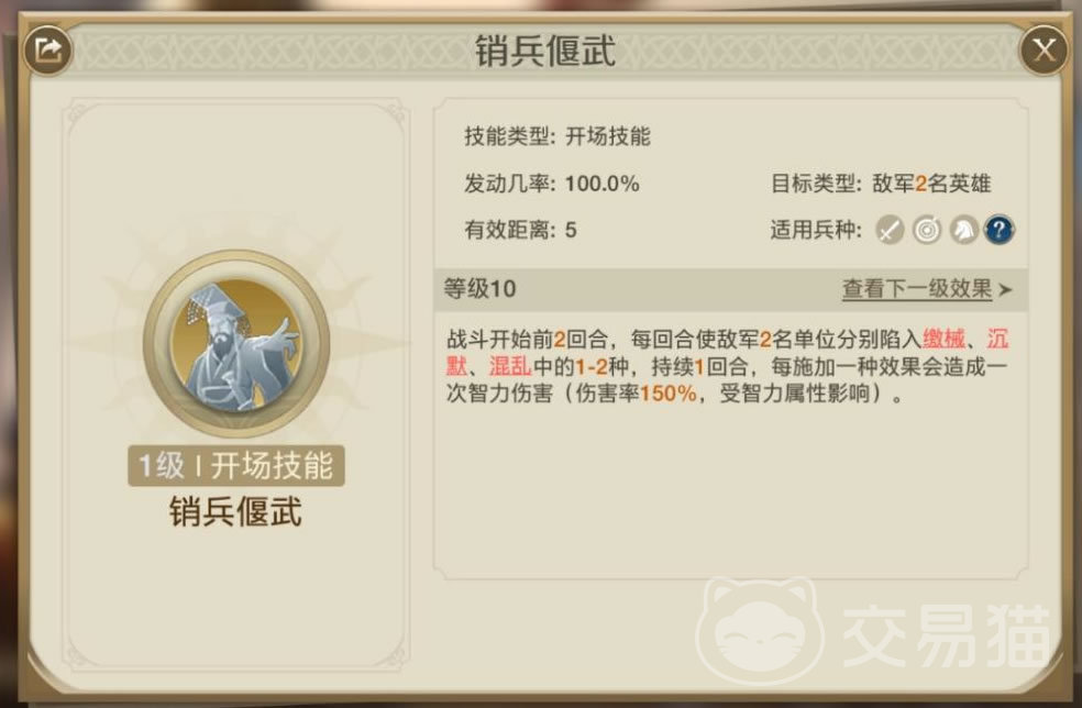 华帝的开场技能非常惊艳,“销兵偃武”在战斗刚开始能在2回合内将敌军2名单位陷入1-2种控制效果,而且每施加一次效果还造成一次智力伤害。本身他的智力就高,加上这个开场技能,简直就是Bug一般的存在。如果再配合上命运羁绊的孟恬和武安君,可以说神挡杀神也不未过。