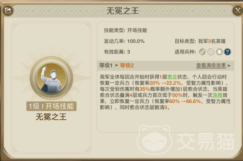 尤里乌斯的开场技能“无冕之王”,是作为治疗回复的神技。在战斗打响时立即就有增益buff每回合恢复兵力;轮到尤里乌斯行动时,又会额外进行与智力成正比的兵力恢复;在每次遭受伤害时有概率额外增加愈合状态,当愈合状态叠加到4层满级时,或者兵力不足50%时,还能触发一次急救效果,立即恢复大量兵力,尽管这次急救后清除了愈合状态效果。这技能简直让人无语,让输出力不够爆炸的对手感到绝望。如果你面对这样的对手,好不容易压下他的血线,没两下又窜上来了,简直就是打不死的小强。
