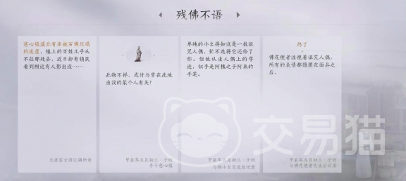接下来我们再将时间调至夜晚,此时天黑后找到佛花使者这个角色,把诅咒玩偶再送给他,即可开启对话,而当对话完成之后,就可以完成残佛不语的这个初始任务。任务完成后,玩家会获得一些相应的奖励,包括30个长鸣玉,十个清河探索度,2500个经验值,2500个周元通宝,这些资源将帮助玩家在后期更顺利的进行任务通关。