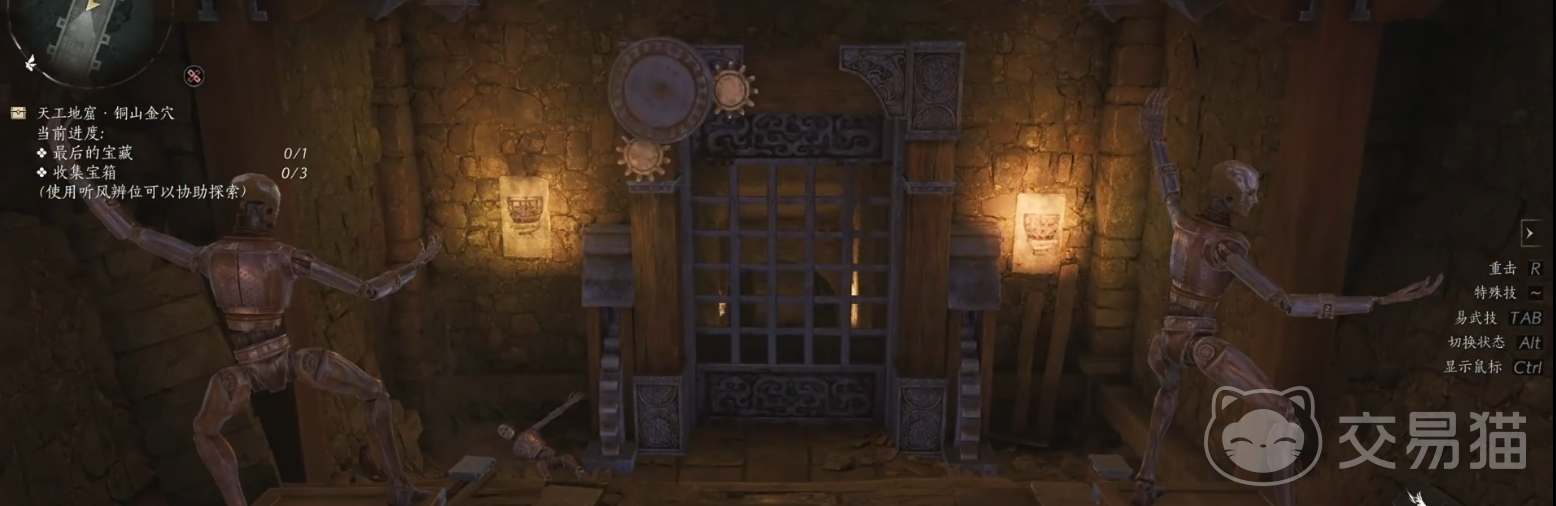 继续旅程,到达最后一个场景。站在中心的圆盘上,需要调整每两个铜人的动作一一对应,还是用点穴技能,即可打开大宝箱的门。