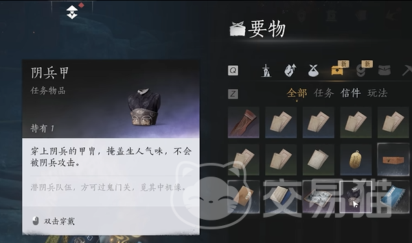 回到鬼市子正门口,再次与最初的黑袍使对话,他会将三个宝物合成阴兵甲交给玩家。使用背包中的B键并双击该装备后,即便是在没有明灯的地方,也不会中毒,且阴兵不会主动攻击玩家。
