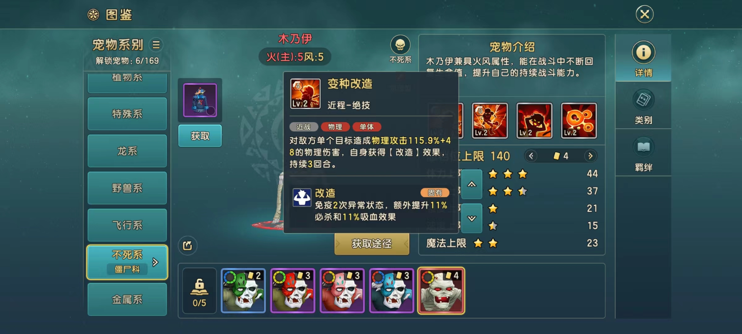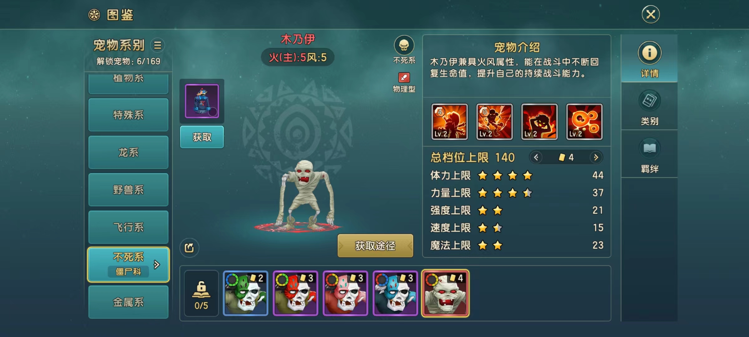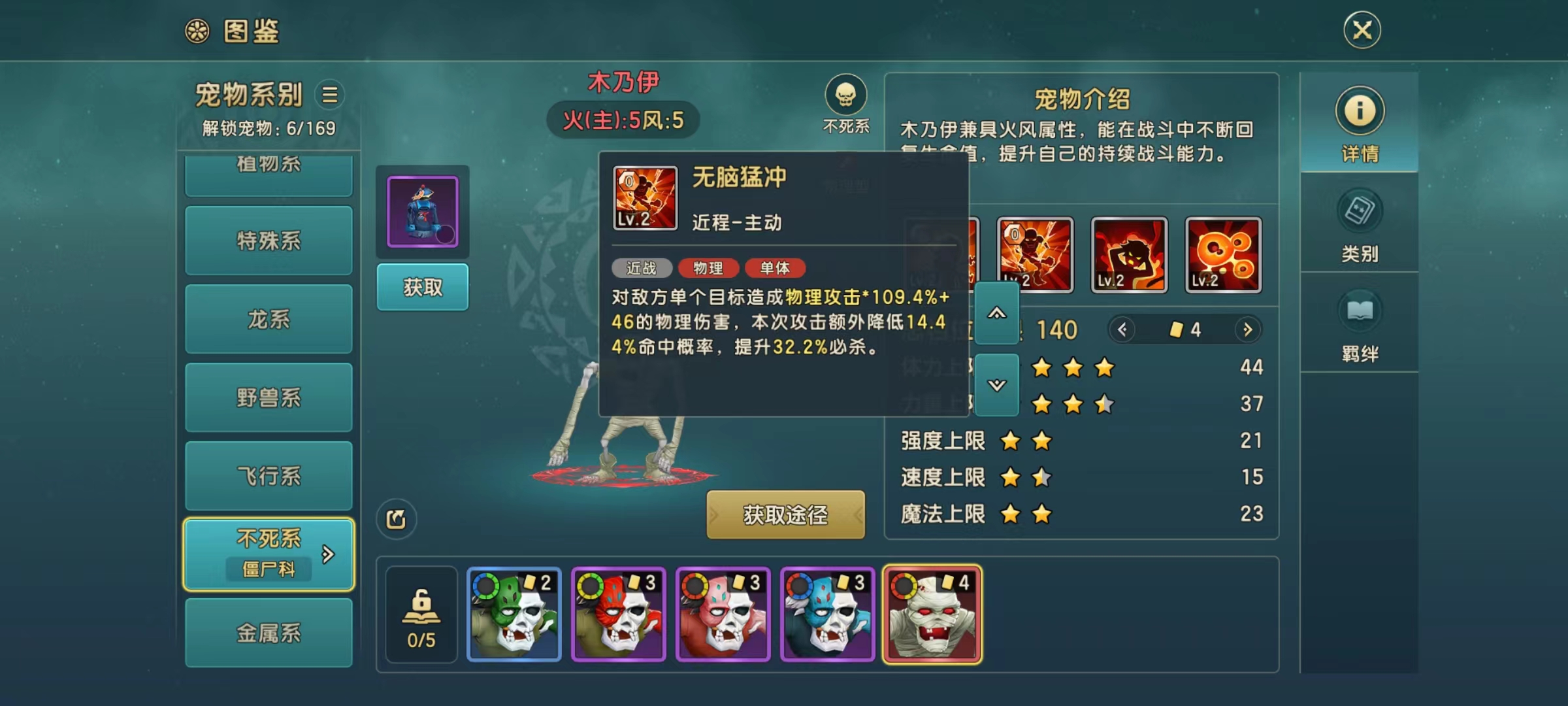 木乃伊具有火风这两项属性,其中以火为主,能在战斗中不断恢复血量,提升持续战斗能力,定位是物理型输出,但也能承担大量伤害。首先是自身的主动技能无脑猛冲,选定敌方单个目标后造成物理伤害,本次攻击还有特殊效果。以降低命中概率为代价,提高必杀几率,升到10级时,能以降低9.96%概率为代价提升49.8%必杀,这样看来这笔生意还是非常划算的,大幅度增加了必杀,使攻击更为犀利。