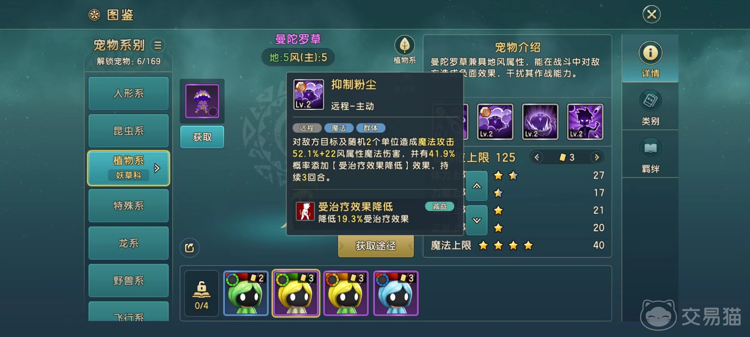潦草系的宠物普遍都具有一些负面效果状态,擅长进行魔法输出,曼陀罗草也不例外。主动技能抑制粉尘,可以伤害一个选定的目标和另外两个随机单位,造成风属性伤害。有几率为目标添加受治疗降低效果,持续三回合。当技能提升到10级时,不仅添加几率大幅提升,还能最多降低对方29.7%治疗效果,这样就大大削弱了对方恢复能力。