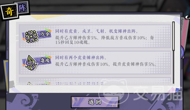 5、阵容变化:添加不同的过关方法和乐趣,增加了【奇阵】系统。在游戏中,目前上场角色的阵容不一样就会带来不同的奇阵作用,玩家能够根据编队/增援页面中的【奇阵】按键查看目前已触发的作用,和其它效果的触发机制。