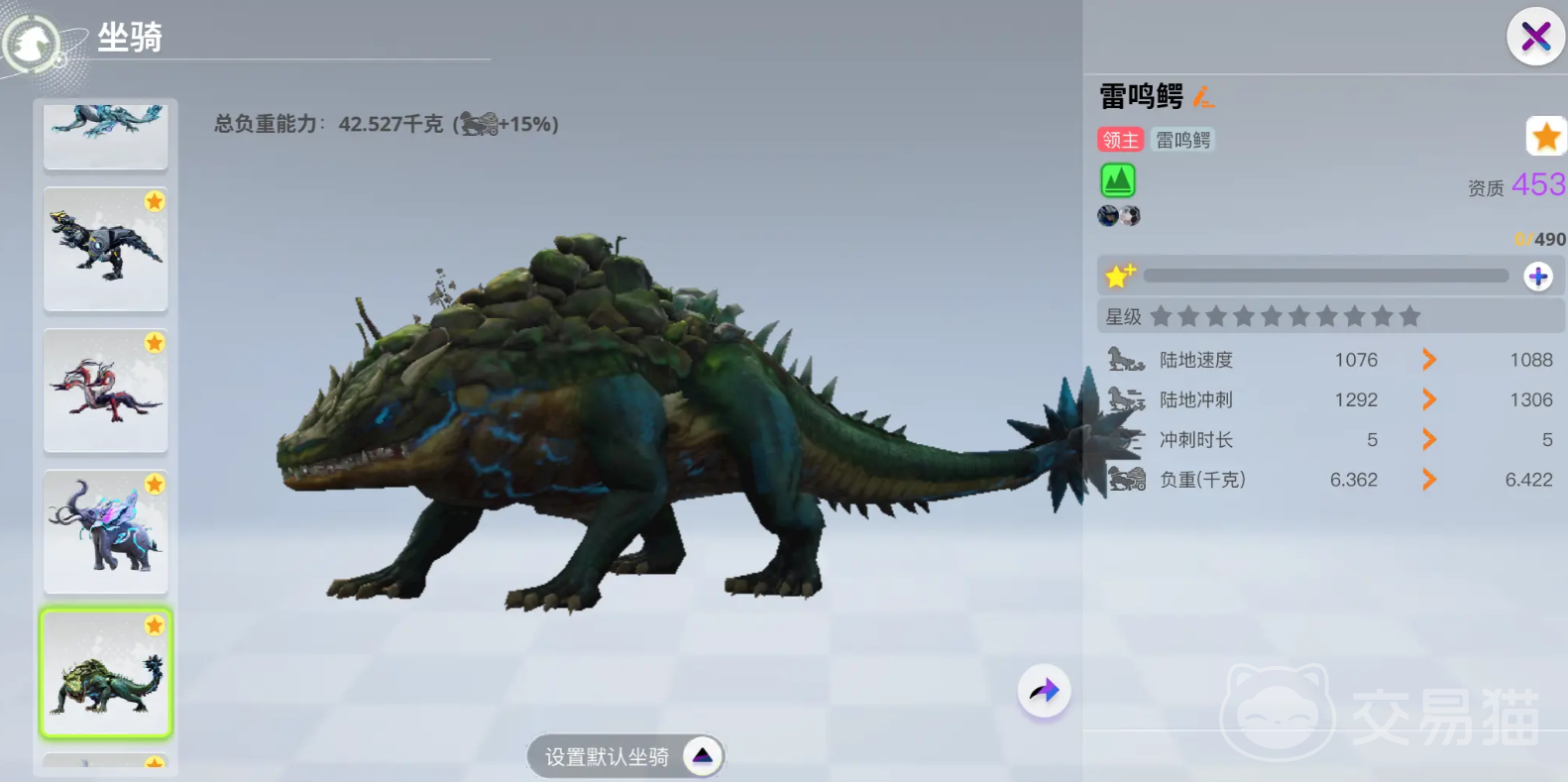 雷鸣鳄的属性是非常不错的,在陆地上的速度足足有上千,同时它的负重也能够达到40千克以上。和其他坐骑不同的是,雷鸣鳄能够让玩家在水中也能飞速行进。