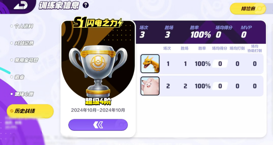 为了让小伙伴们更加了解对局的情况,增加了成长目标和奖励,同时还可以随时随地查看朋友挑战的进度,当然还有对训练家个人信息页面进行了一系列的优化调整。现在,你可以在这个页面上清晰地查看到每个赛季排位赛和主题挑战赛的详细数据,包括胜场、胜率、MVP次数等,还可以在查看在比赛中比较有默契的队友、高胜徽章组合等信息。这些数据将帮助你更直观地分析自己的对战情况,优化对战策略,更快地迈向大师荣誉。同时,玩家信息页面中还新增了登录的天数,集结参赛证,和宝可梦电子服以及训练家时装数量信息的展示情况。通过这些信息,你可以更清晰地了解自己在游戏中的收藏进度,为自己设定更加明确的目标。