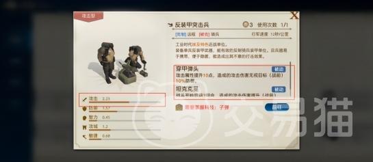 工业时代远程兵种,具有相当高的攻击力,其两个被动技能穿甲弹头和坦克克星使该兵种在面对重装甲单位时能造成高额伤害,适合用于破坏敌方建筑物,解锁条件为掌握科技“子弹”。