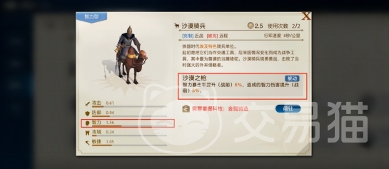 铁器时代的智力型兵种,拥有“沙漠之枪”被动技能,能提升暴击率和伤害输出,同时具备良好的防御和敏捷性,使其成为进攻和防守的可靠选择,解锁条件为掌握科技“金属铸造”。