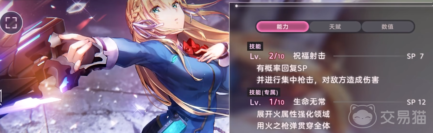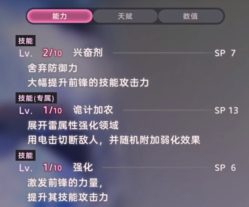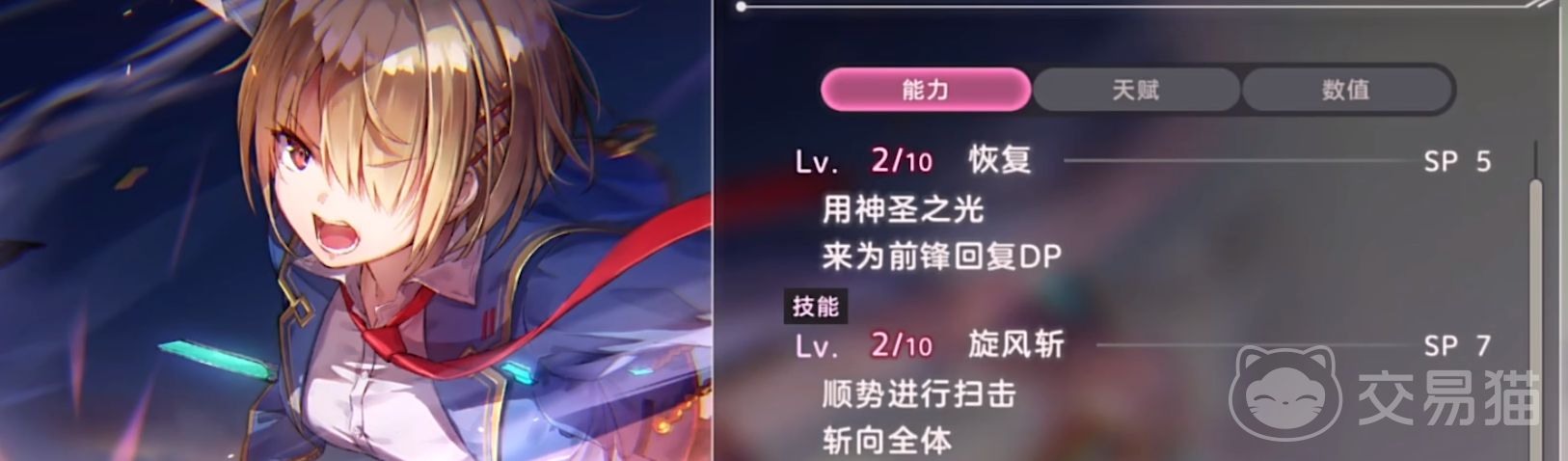 接下来是圣华,这位是属于雷属性的角色。职业同样是增益。这位角色的整体能力比东城司要强上一些。她的1技能也是增加前排的攻击力。2技能则是则是将前卫的攻击力大幅度增加,但是本身的防御力会减少100%。