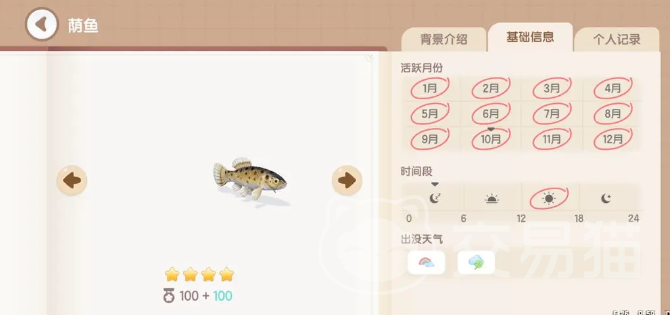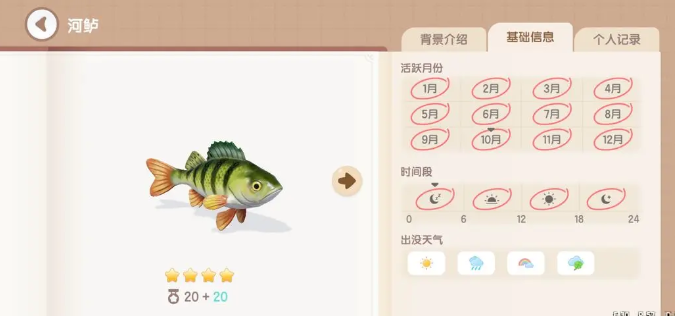 河鲈作为游戏中最常见的河鱼之一,没有时间以及天气的限制。因此要想钓到此鱼,玩家只需找到一条河,便有概率获得。