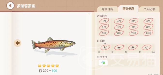 这条鱼只在幸运天或者彩虹天才会出没,同时玩家只有在中午12点到下午18点这一时间段,才有概率获取该鱼。