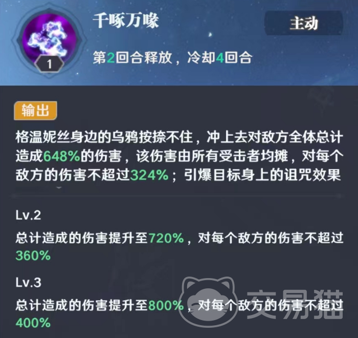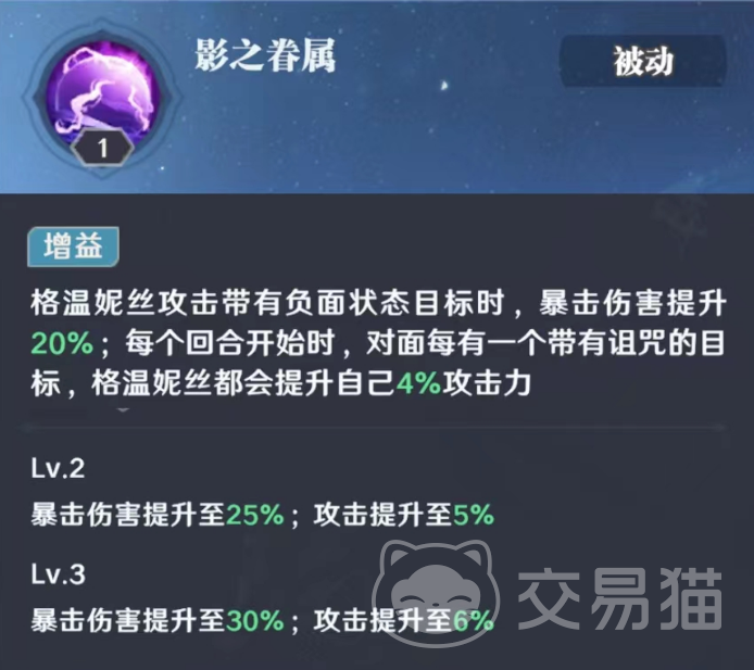 最后一项技能是【影之眷属】,当攻击带有负面状态的敌人时,黑鸦夫人格温的暴击伤害会得到显著提升。此外,每轮游戏开始时,只要对方有携带诅咒的目标,她的攻击力就会增加4%。随着技能等级的提升,暴击伤害最高可提升至30%,攻击加成也能累积至6%。如果对面的诅咒层数较多,通过这种叠加效果,她所能造成的伤害输出将非常惊人。