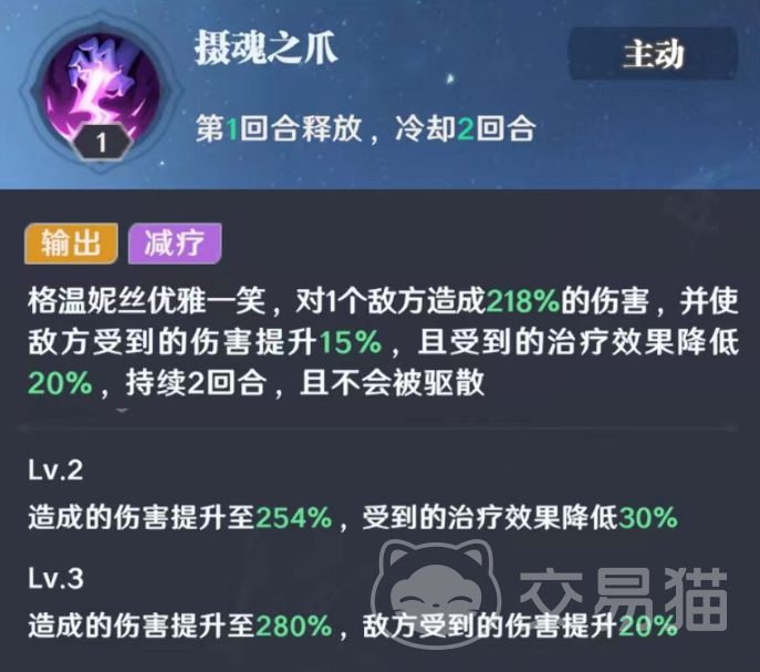 黑鸦夫人格温的第一项技能名为【摄魂之爪】,它能够对敌方单个单位造成显著的伤害,并降低其受到的治疗效果20%,效果持续两个回合且不可被移除。这项单体攻击技能不仅能增加对手的受伤程度,同时也能有效遏制敌对单位的治疗能力,是迅速削减对方战力的关键。
