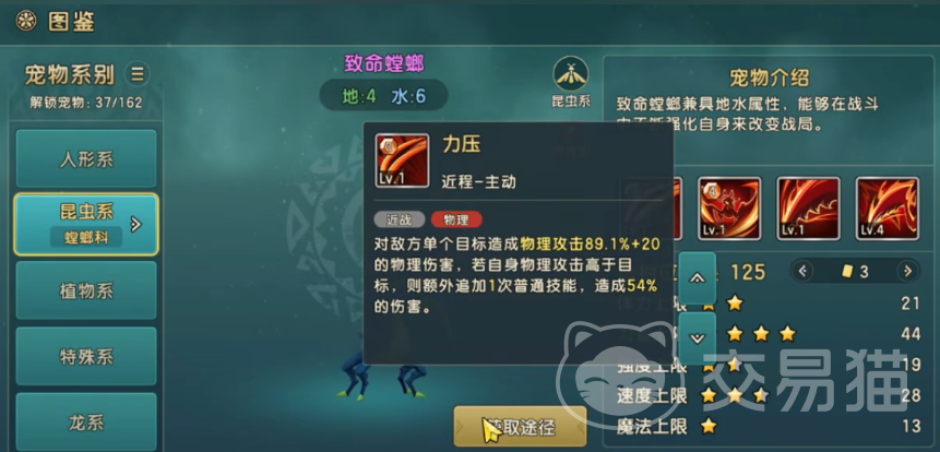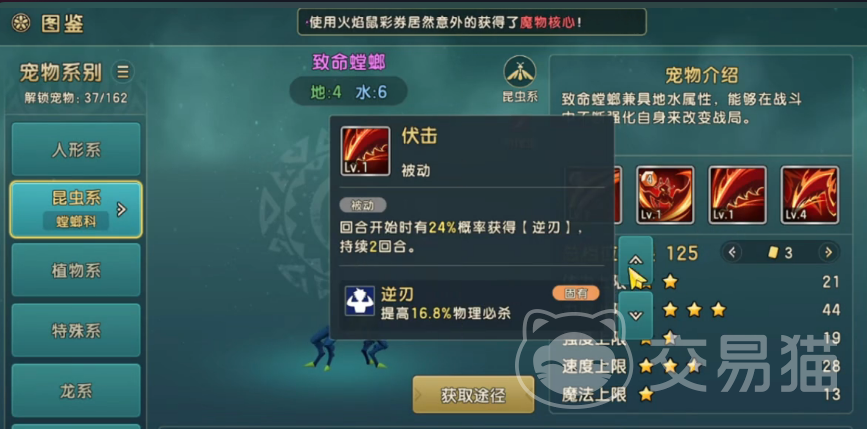 而且致命螳螂的普通攻击也相当给力,如果它的攻击力超过了对方的物理防御,还能追加一次攻击,造成额外的伤害。这种“锦上添花”的能力,让它在战斗中更加游刃有余。更别提它那强大的被动技能了,战斗一开始就能为全队提供一波可观的战力加成,效果持续两回合,简直就是战斗初期的强力BUFF。