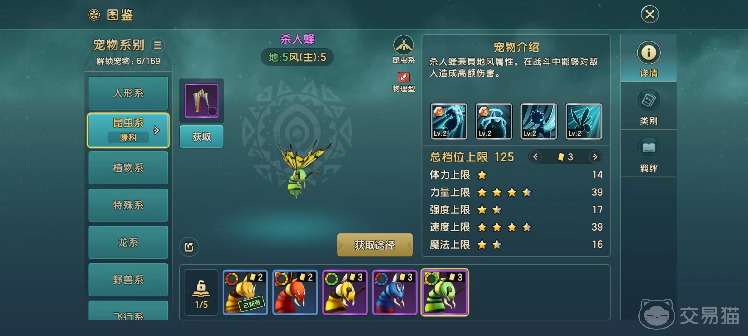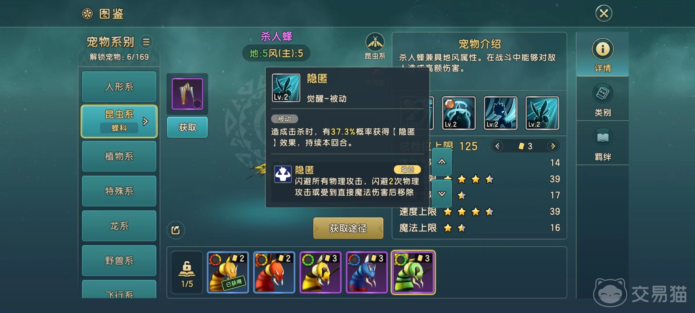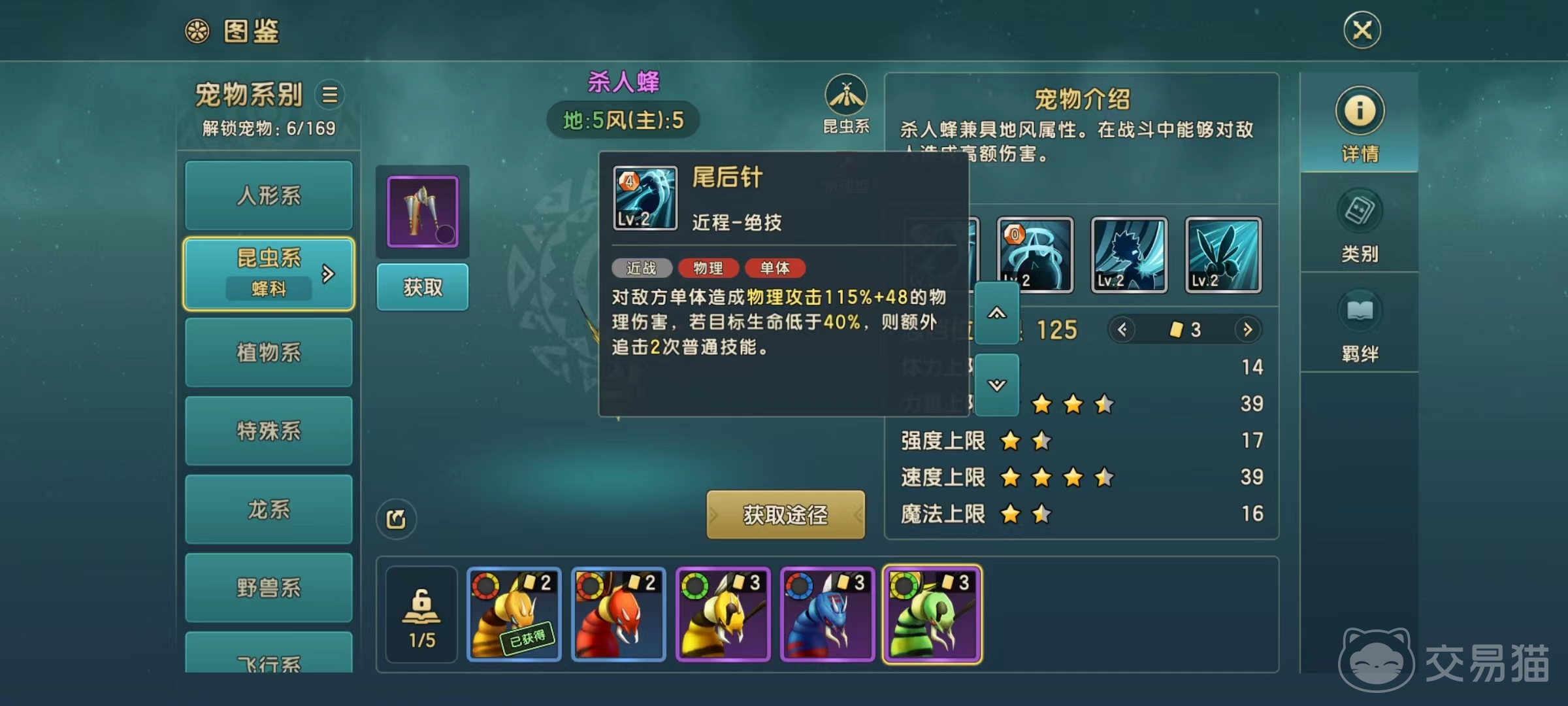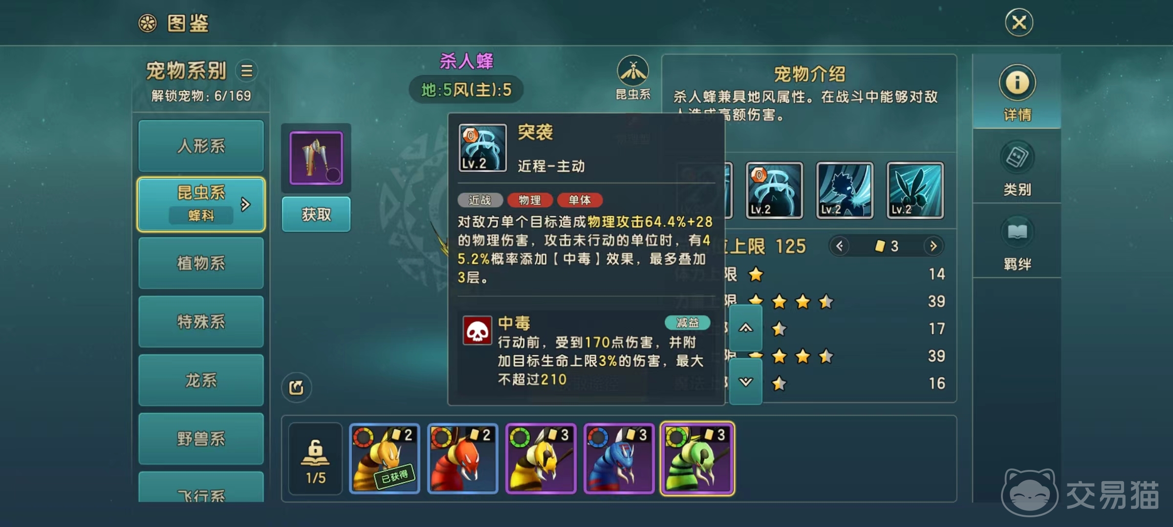 从属性方面来看,体力上限非常低,但力量上限和速度上限都很高,这也就意味着可以在战斗中率先出手,并且输出有保障,只是容易被对方秒掉。主动技能突袭,物理输出对方单个目标,如果攻击的是对方没有行动的单位,则有几率添加中毒效果,中毒最多能叠加到3层。杀人蜂锁造成的中毒和蝎科造成的中毒效果是一样的。依靠自身速度比较高的特点,绝大多数宠物都没有杀人蜂出手快,所以大概率能添加上中毒。