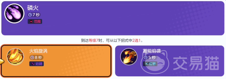 召唤3团会飞向指定地点的火焰,火焰飞过会引发爆炸对触碰到的敌方英雄造成伤害,同时可以在短时间内降低目标一定的移速。这个招式可以升级为“火焰旋涡”或者“蓄能焰袭”,前者会跟随距离最近的敌方英雄移动,并降被卷入其中敌方英雄的移速,持续一段时间或是对方英雄被卷入中心火焰伤害会更高,造成更频繁的伤害并且能短时间内让对手无法动弹。