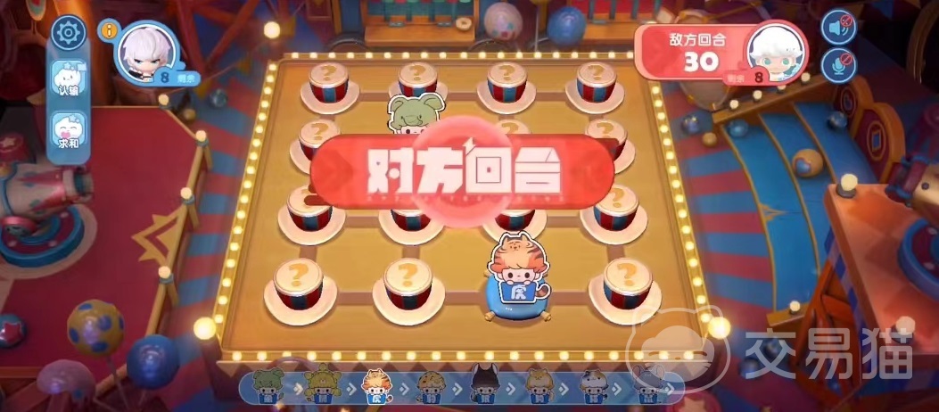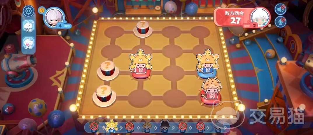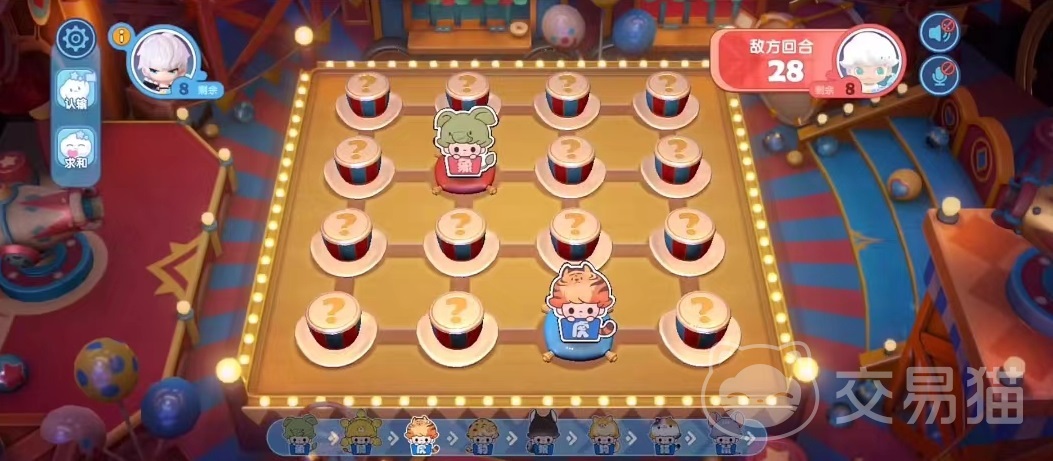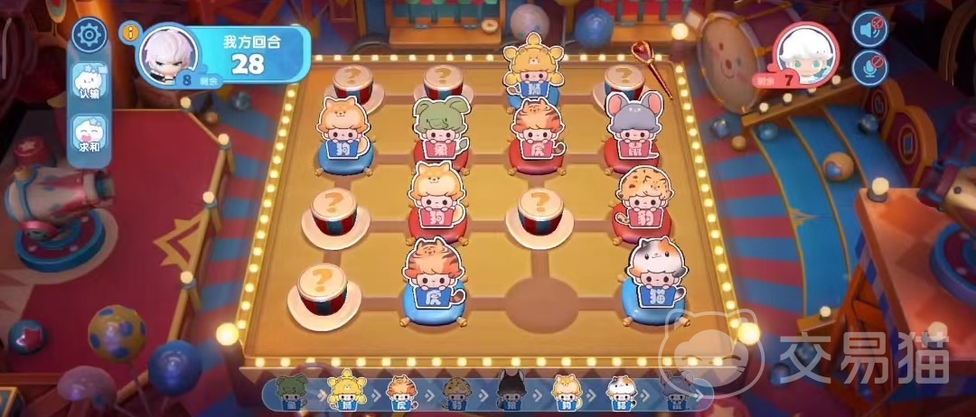 进入活动后,棋盘和现实中的斗兽棋非常相似,是一个非常好玩的小游戏,玩法也简单,上面共有16颗棋子,但都是隐藏状态,需要点击这些隐藏的棋子,才能够将它翻过来看到后面的动物是哪一类,以及棋子的归属。两人共用一个棋盘,都可以随意点击棋子打开,只有把对面棋子全部吃光后才能够判定获胜。就是简单的大鱼吃小鱼的规则,下面会显示相应的战力大小。