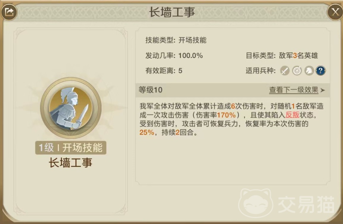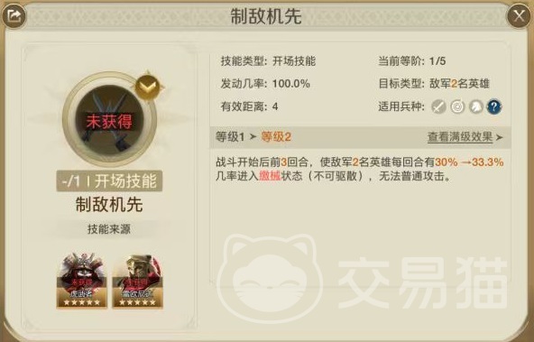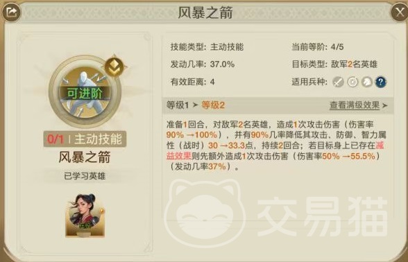 另外在自身的技能搭配方面,除了自带开场类型之外,还可以在二、三技能位置搭配上风暴之箭和制敌先机这两个技能。风暴之箭需要准备一回合,对敌方两名英雄造成攻击伤害,还有几率降低对方的各种属性,制敌先机是在战斗开始后前三回合,使敌方两名英雄有几率进入缴械状态。