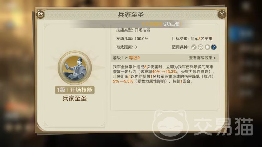 在进行阵容搭配之前,大家首先要了解一下兵圣所能发挥出来的主要特点。他的自带技能为开场技,100%发动率,在全军累计造成5次伤害后,可以立即为受伤最多的英雄恢复兵力,并使得距离以内的随机一名敌方英雄造成的伤害降低。这是集团队治疗和减伤为一体的辅助神技,如果搭配上兵圣的专属头衔,还能让减伤效果再次提升。非常适合搭配那些能够打出多段输出的队友,提供的成堆奶量,让对方全体轮流吃减伤的状态,再配合上增伤的团队技能,从开局就能让队伍处于强势状态。至于2、3这两个技能,可以自由选择,推荐携带一些控制类的辅助技能或者是开场辅助技,让战斗中的优势最大化。例如整顿或者是围点、控局等,这一类功能性比较强的驱散类减伤都很适合选择。