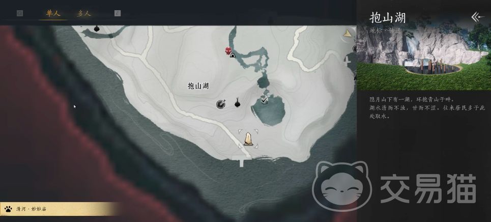 想要学习该技能的方法非常简单,玩家需要先来到抱山湖的传送点具体位置的话,就是小编在下图当中的光标所在处,大致在抱山湖的右下角。如果你实在找不到,那么可以先抵达隐月山,在隐月山下方就可以看到这一湖畔了。