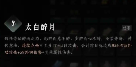 太白醉月是游戏当中能够提升玩家外公方面相关技能点的一个武林绝学。太白岁月是假托,诗仙醉酒之态,行醉而亦不醉,不醉而心不遂,一个刚柔并济的功法,连续点击最多可打出五段攻击伤害,并且对目标造成856.41%的外功攻击和59外功伤害。对于很多想要提高外功指数的玩家来说是必拿下的一个武学技能了。