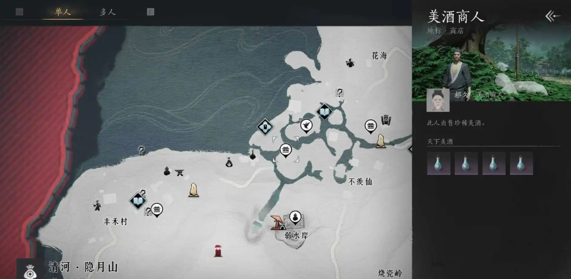 而要想获得干技能方法也是非常简单的,玩家可以先前往如图所示的位点,这个位点位于若水岸上方的商店当中玩家找到美酒商人,把店内的12瓶酒全部买下,并且将所有的酒都喝下,就可以解锁太白岁月这一功法了。至于说它的使用,小编认为还是要和神龙吐火一起使用,能够释放更强的大招。