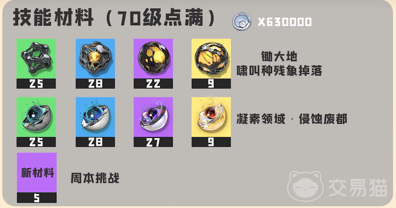 接下就说说要怎么去准备升级材料。根据游戏设定,我们是可以提前预测所需材料的。大家如果想要从0级到90级将角色等级和技能全部提升至顶级水平,共需29个低频啸叫声骇、40个蓝色材料、49个紫色材料以及61个金色材料。这些材料可以通过刷取啸叫种残象获得,角色突破所需的龙吐珠材料,总计需要60朵,玩家可以参照点位图或观看收集视频以便高效获取。