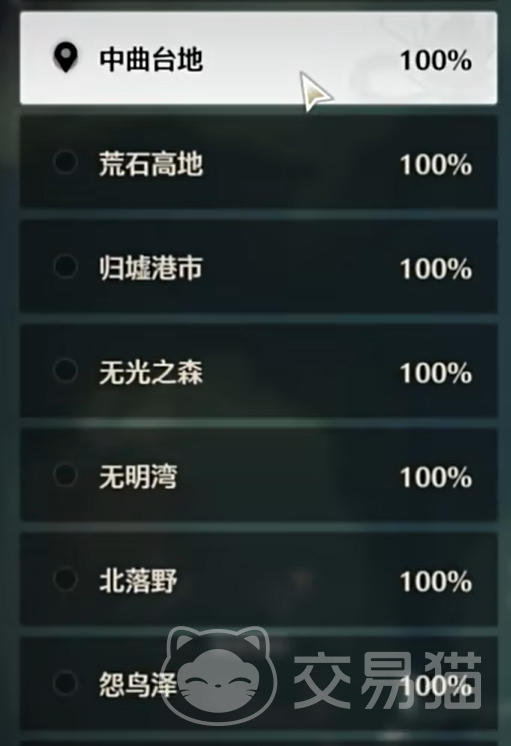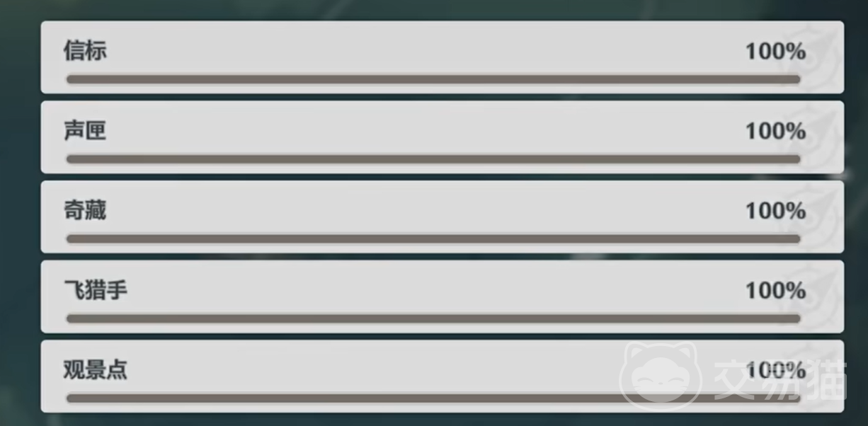 页面中的右侧会展示当前选中区域的各项收集情况,包括信标、声匣、奇藏、飞猎手和观景点等。通过仔细检查这些收集数据,玩家可以清晰地了解哪些项目已经完成,哪些仍未达到100%的完成度。