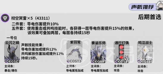 彻空冥雷:这是值得的选择,二件套可以有效提成10%的导电伤害。五件套可以在使用共鸣技能时提升到电伤害的同时,还可以拥有两层叠加效果,每一层可以持续15秒。这一套搭配还是比较不错的,能够有效符合重疾机制,另外在后期还能有效提升输出伤害。