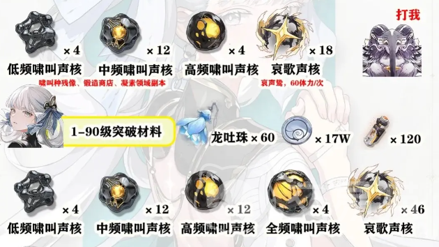 其实众多的玩家也比较清楚,养成材料玩家要提前准备,一般要准备60个龙吐珠,25个低级啸叫声骸,额外还要准备哀歌声骸46个,中级高级啸叫声骸28个和40个,全频道啸叫声骸57个。