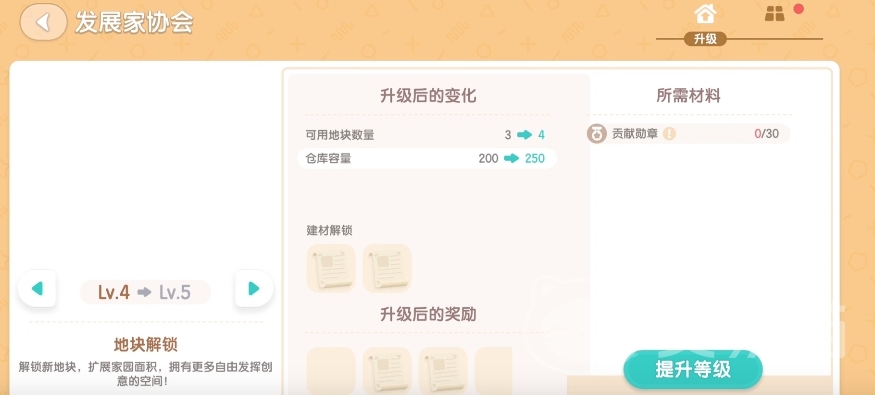 所谓发展家协会,在游戏内就相当于我们的个人等级,发展家协会的等级越高,玩家所能解锁的地皮数量就会越多,同时能够摆放的建材、家具,还有完成的任务数量都是更多的。总而言之,玩家在游戏内的主要目的就是提升自己的发展家协会,这样才能让自己解锁更多的玩法体系,让自己的庄园变得更加广阔美丽。