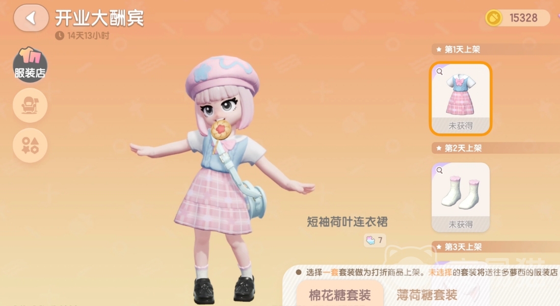 目前游戏内的棉花糖套装大体分为两个套系,分别是服饰和家居套,这两个套都是可以在开业大酬宾活动中获取的,在我们的等级达到7级之后,去找到波叔NPC可以与其进行对话,对话之后玩家可以触发开业大酬宾活动,在这里我们可以购买到各种各样的绝美套装,而且都是拥有最低折扣的。
