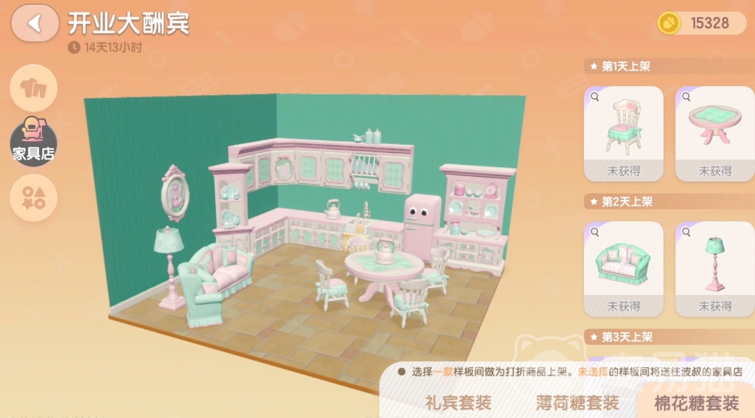 服饰的话分为棉花糖套装和薄荷糖套。。玩家可以任选其一进行打折购买,基本上能打1.2折左右。第二个是家居套装,分为礼宾套装、薄荷糖套装以及棉花糖套装,从套装的整体配饰上可以看出,棉花糖套装都是非常粉嫩的感觉,可可爱爱的,很是精致,比较适合女孩子。